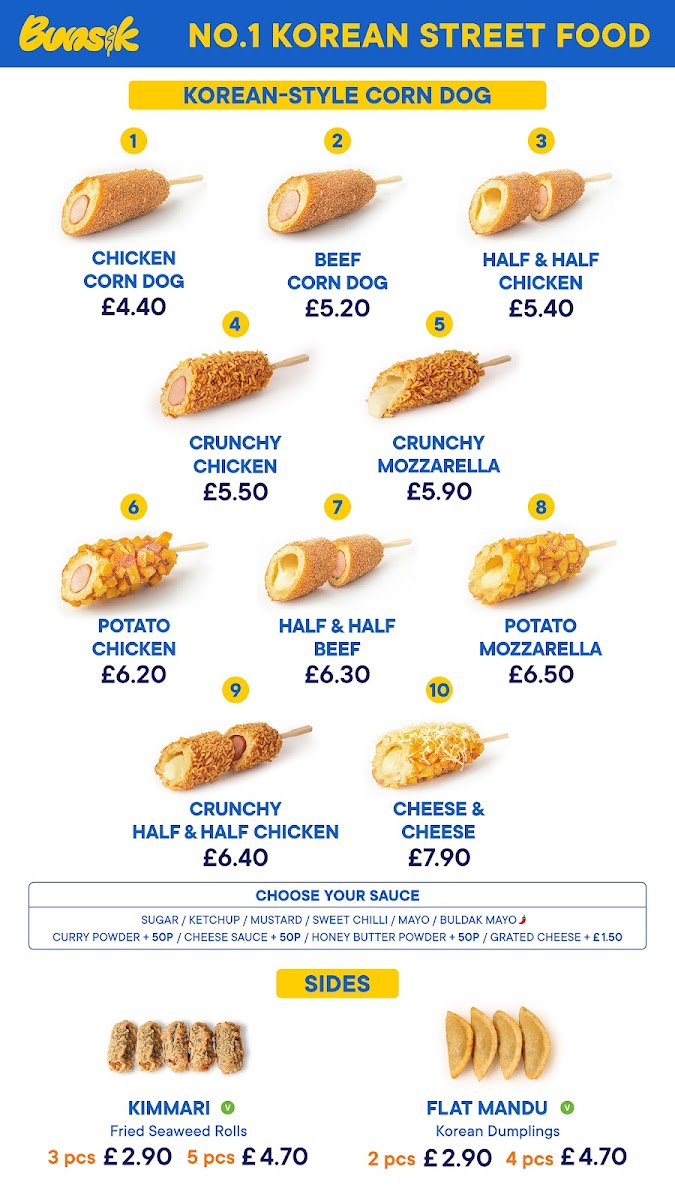 Welcome to Bunsik, a delightful haven for Korean street food enthusiasts located at 62 Charing Cross Rd, London. Bunsik offers a vibrant menu featuring a variety of mouthwatering Korean-style corn dogs, with options ranging from the classic Original Corn Dog at just £4.00 to the indulgent Cheese & Corn Dog for £7.50. For those seeking a twist, the Half & Half Corn Dog combines textures and flavors beautifully.